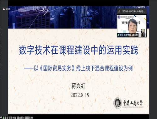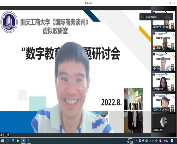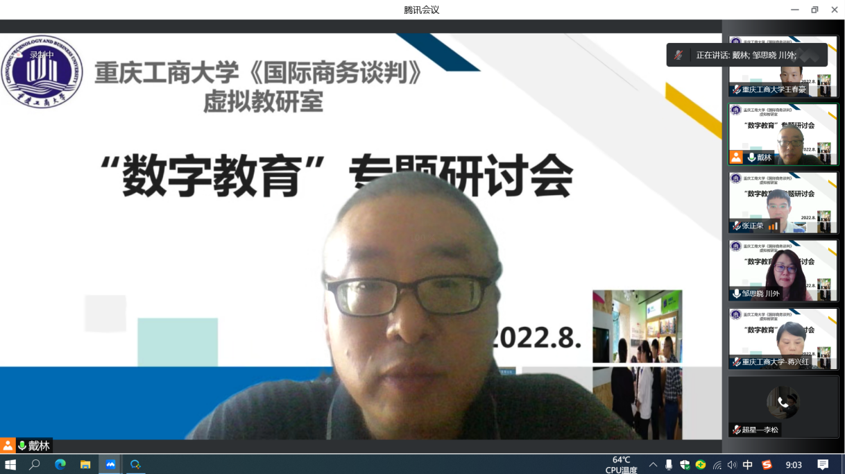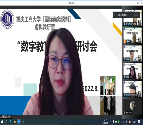 2022年8月19日,重庆工商大学校级虚拟教研室,《国际商务谈判》虚拟教研室“2022数字教育专题研讨会”在腾讯会议平台成功举办,会议由教研室负责人戴林副教授主持,校外成员浙江理工大学管理学院跨境电子商务研究所所长张正荣、四川外国语大学国际金融与贸易学院国际经济与贸易系主任邹思晓以及校内成员蒋兴红、王春豪、冉梨等老师参加了会议,特邀超星公司李松、张秋林和刘文静老师参加研讨。