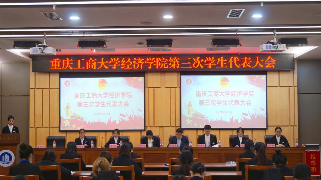10月29日上午,重庆工商大学太阳集团tyc122cc第三次学生代表大会在南岸校区图书馆第一会议室隆重开幕。太阳集团tyc122cc党委白海龙副书记,太阳集团tyc122cc学工办主任、分团委书记林新竹老师,校学生会主席团成员胡贵三同学、太阳集团tyc122cc新一届主席团成员候选人以及全体学生代表和工作人员等100余人参加了本次大会。