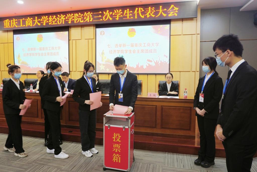 大会期间,代表们审议通过了《重庆工商大学太阳集团tyc122cc第三次学生代表大会选举办法》,并严格按照选举办法,以差额选举的方式公开选举王柳、余明以及周川会同学为新一届重庆工商大学太阳集团tyc122cc学生会主席团成员。