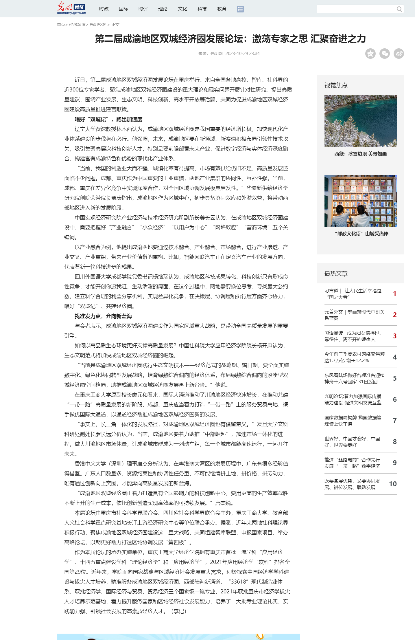 10月29日,我校参与承办的第二届成渝地区双城经济圈发展论坛受光明日报和光明网报道。原文如下: