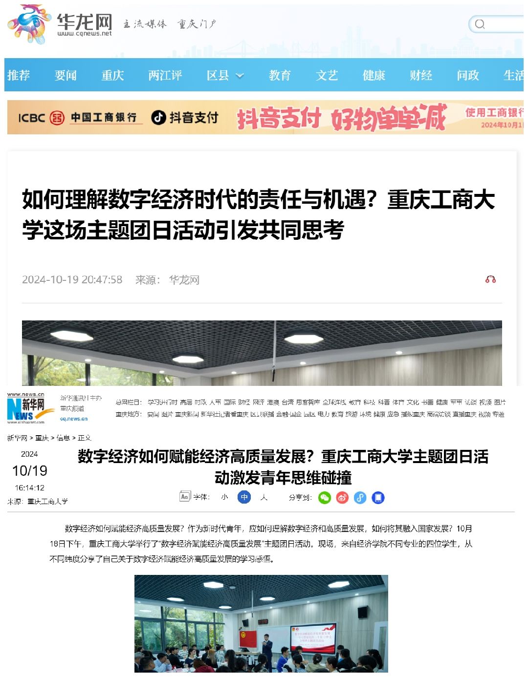 10月18日下午,重庆工商大学举行了“数字经济赋能经济高质量发展”主题团日活动。活动由2024级经济学联合学士学位项目班的学生们共同参与,旨在深入学习数字经济如何推动经济高质量发展,并探讨新时代青年的责任与机遇。华龙网和新华网对此进行了报道。