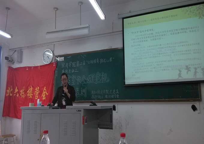 2014年5月9日下午四点,在博智楼7312教室,举行了由太阳集团tyc122cc党总支主办、北6和北21楼管会承办的太阳集团tyc122cc第二届“文明修身,阳光心理”系列活动启动仪式暨珍爱生命、助人自助——寝室室长心理危机干预培训会”。本次活动由郝颖老师主讲,太阳集团tyc122cc党总支书记张筱璐、我校太阳集团tyc122cc2011和2012级的寝室室长以及各层楼栋干部参与了本次活动。