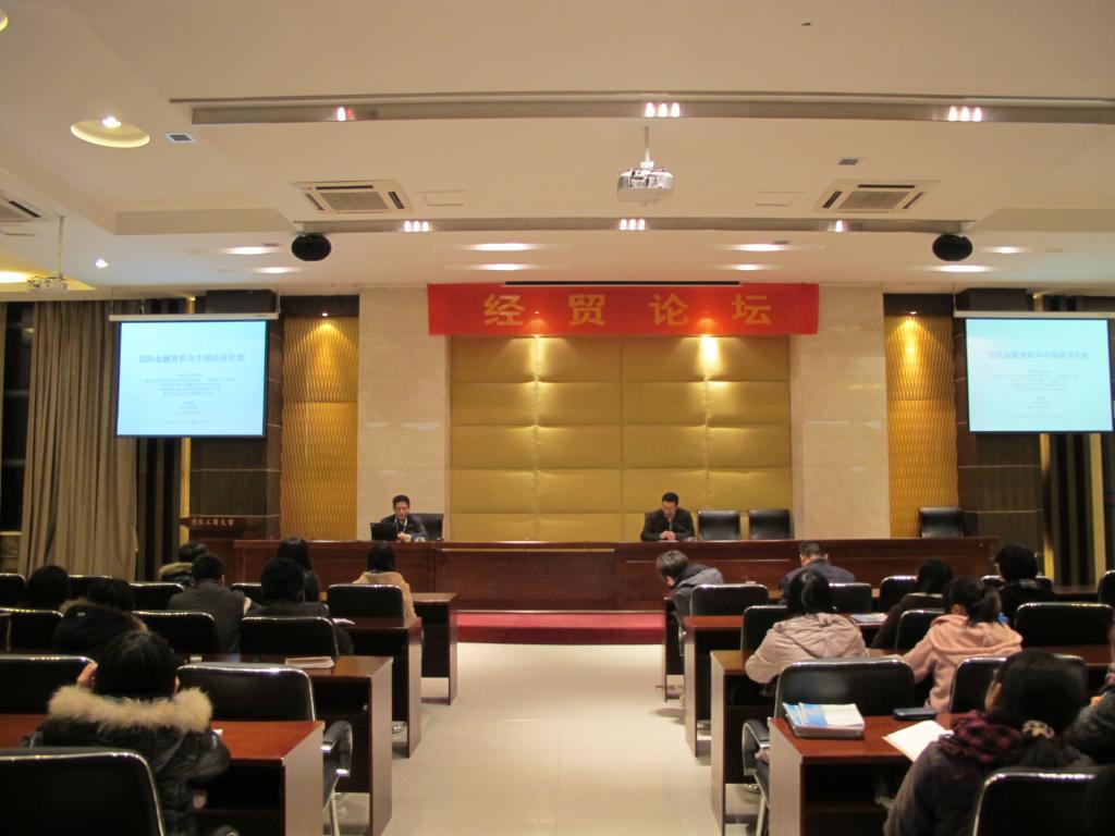 12月5日晚上,经贸学院主办的经贸论坛在田家炳408学术报告厅成功举行。中国社会科学院数量经济与技术经济研究所副所长、二级研究员、博导,中国经济分析与预测中心常务副主任,中国循环经济与环境评估预测中心主任,重庆工商大学经贸学院名誉院长齐建国教授应邀作了一场以“国际金融危机与中国经济形势”为主题的讲座。经济贸易学院李华平副书记,孙建博士,以及经贸学院本科生和研究生参加了本次讲座。讲座由李华平副书记主持。
