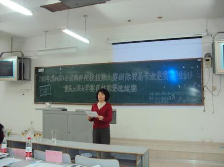 ——经济贸易学院成功举办全国商科院校技能大赛国际贸易专业竞赛(学生组)重庆工商大学赛区选拔赛3月31日晚,第四届全国商科院校技能大赛国际贸易专业竞赛(学生组)重庆工商大学赛区选拔赛在博智楼7401教室拉开帷幕。此次选拔赛是由经济贸易学院党总支主办,北6党员服务站、楼管会承办。经贸学院党总支书记宋豫教授、经贸学院学团办主任杨华俊老师、喻智成老师作为嘉宾与图书馆副馆长饶光明教授、研究生处副处长戴林副教授、经贸学院蒋兴红老师、舒红老师、郝颖老师组成的评委团共同出席了本次选拔赛。学院2008级、2009级、2010级国贸专业的同学观摩了此次比赛。