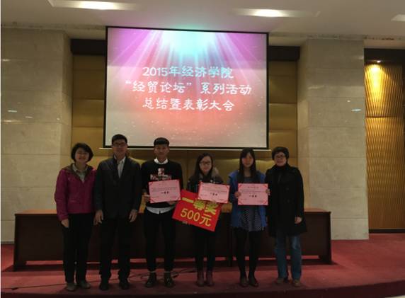 “经贸论坛”系列活动是学院为培养学生学术意识、提高专业素养量身打造的专业活动,活动由学院94级校友喻亮星先生赞助支持,今年是第八届。会议开始,雷菁副书记介绍了本次“经贸论坛”的总体情况。本次“经贸论坛”从最初的宣传布置、到开展一直到最后顺利完成,历时三个月,共收取来自各个年级各个专业同学的论文29篇,本次作品整体水平较高,选题广泛,内容新颖,其中包含了对经济热点问题的分析、关注民生时事政治的发展、关于互联网与经济发展之间的内在联系,还有为农村经济发展出谋划策和对于大学生择业就业方面的探讨。经过评审,共评出一等奖3名,二等奖5名,三等奖10名。