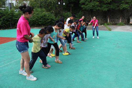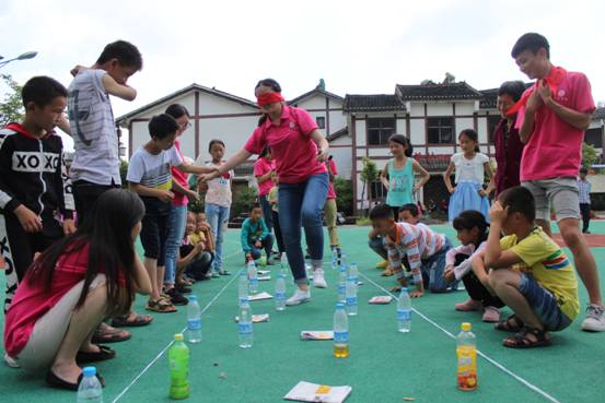 当天下午,实践团成员为孩子们带去了一场充满趣味的素质拓展活动。在“无敌风火轮”、“地雷阵”、“盲人足球”等团体活动项目中,孩子们玩得不亦乐乎,现场充满了欢声笑语。在轻松愉快的氛围中,孩子们彼此距离拉近,体会到了和其他人团结合作、互相信任的重要性,相互合作取得的成功更有意义!