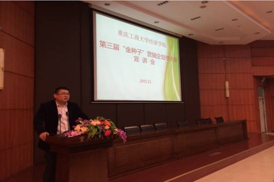 2015年11月5日晚,第三届“金种子”营销企划书大赛宣讲会在重庆工商大学江北校区宏智楼B509顺利举行。帝邦机械动力有限责任公司总经理、98级优秀校友曾凡聪先生,太阳集团tyc122cc党总支张筱璐书记,太阳集团tyc122cc辅导员蒋敏老师,金种子实践运营团队出席了本次宣讲会。