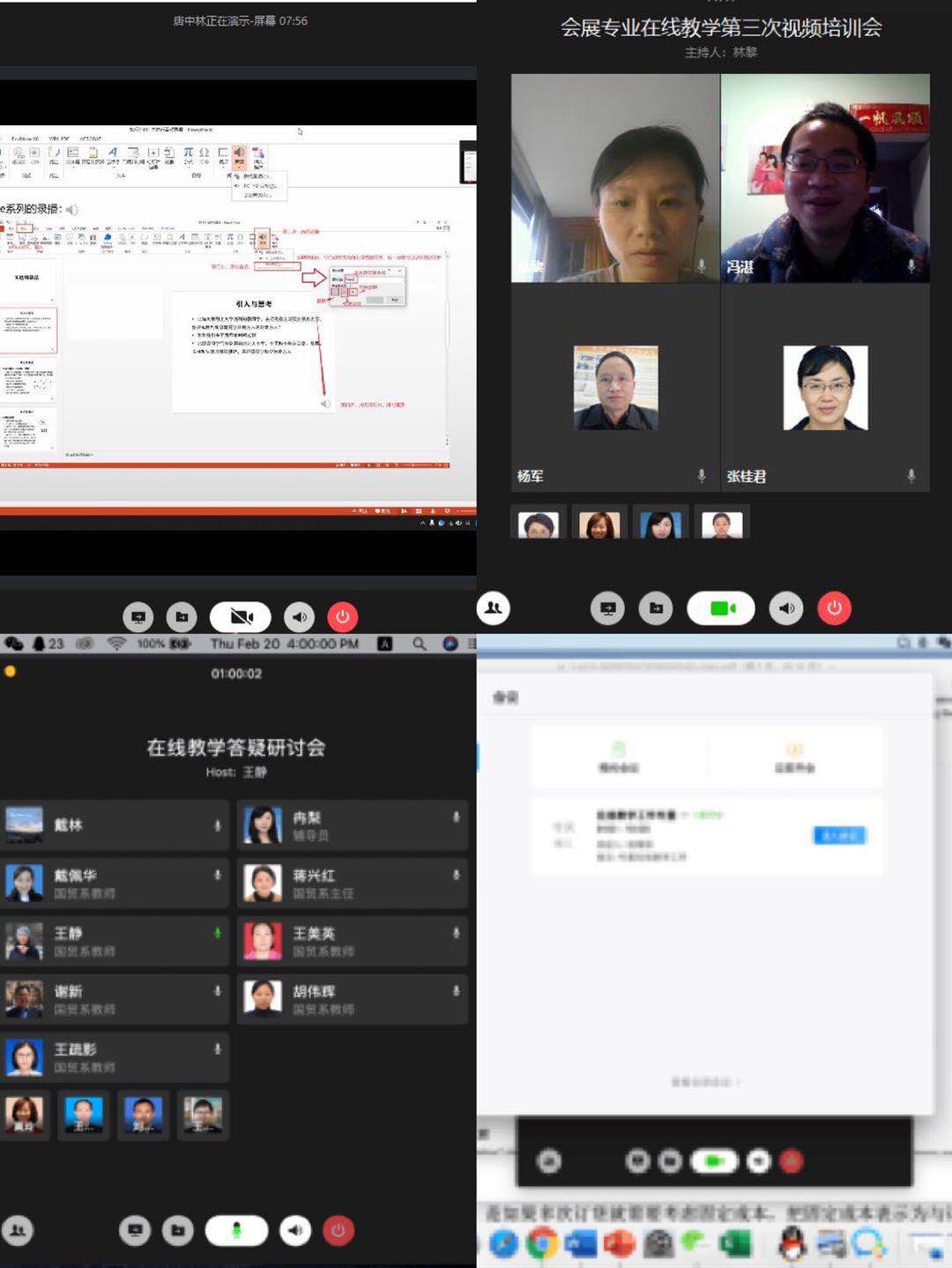 培训形式多样化。技术指导老师开展了形式多样的培训,经济系技术指导教师唐中林在企业微信上组织《如何在PPT中进行音频录播》培训视频会,通过课件展示、实操演示,给大家详细讲解音频制作、保存及播放问题,并就企业微信使用过程中的常见问题进行了一一解答。会展专业冯湛老师开展了在线教学系列讲座,重点讲解操作技巧,包括:创建课程基本信息、建立单元学习内容、上传教学资源、开学教学互动和课程活动、查看学生平台使用次数和完成度、手机版优慕课AAP使用等相关内容。国贸系王静老师则围绕在线教学的课前准备、课中讲授、课后指导三方面展开培训,并展示了学校在线教学平台的各项功能,对教学过程中可能遇到的问题和突发状况进行了探讨。贸经系王辉老师培训了如何使用屏幕分享、文件分享以及出现设备故障如何解决,解释了ppt录制和幕客使用中出现无法录制和投屏等问题。除此之外,各技术指导老师跟“一对一”帮扶对象随时保持联系,对出现的问题进行耐心答疑和交流。各位老师还在培训中模拟上课场景,进行现场演示,并就他们在演示过程中遇到的一系列问题进行了提问,培训老师进行逐一回答,大家共同讨论,对在线教学技术有了更深入的学习。