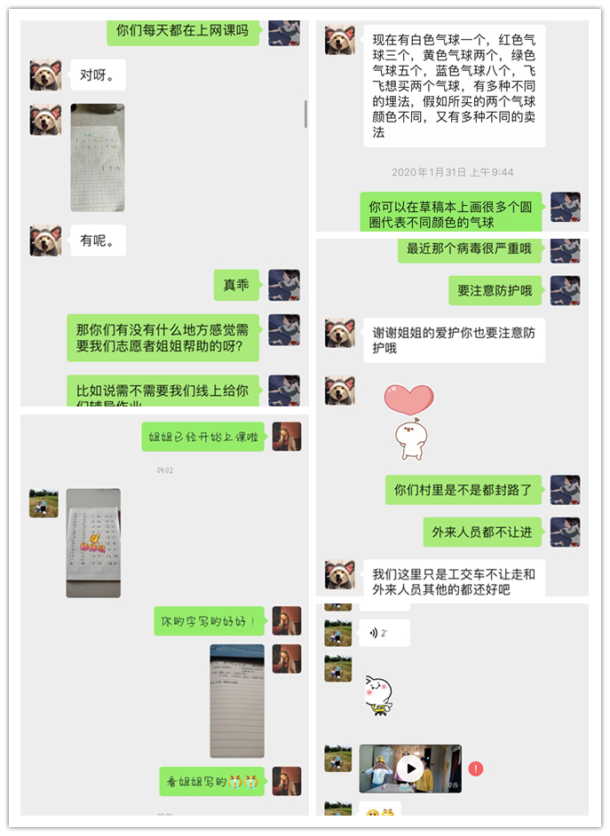 今年是太阳集团tyc122cc志愿者帮扶营盘村孩子们的第八个年头,每年如期而至的爱心包裹和暑期实地走访已经成为了孩子们的期待与牵挂。而如今在疫情防控的关键时期,志愿者们仍然坚持采用线上的方式开展教育扶贫和扶智工作,主要从心理和学习两方面对营盘村的孩子们进行线上指导。志愿者们通过微信、QQ、电话等方式对营盘村的孩子们给予远程的关心与问候,询问了解孩子们的衣食住行,以及疫情期间家里的生活现状,实时关注每一位孩子的心理感受并适当鼓励支持。同时向孩子们传播正确的疫情知识,让他们能够了解并做好有效的防护措施;耐心细致对孩子们进行线上功课辅导,让孩子们停课不停学。