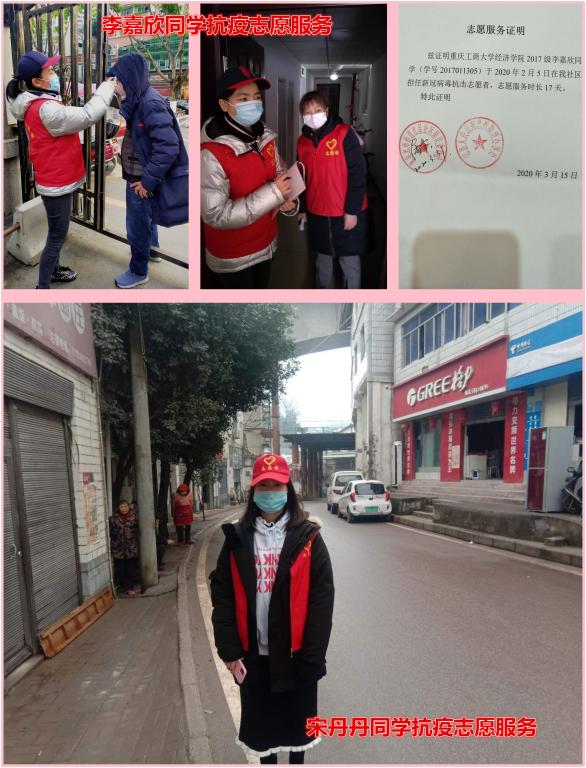 太阳集团tyc122cc2017级贸经一班宋丹丹同学自2月19日以来,积极参加重庆市万州区大周镇常家坪社区的志愿抗疫活动,作为一名入党积极分子,她时刻谨记党的指导方针,不畏艰辛,直面疫情。宋丹丹同学每天从早上9:00工作到下午17:00,分别在交通要塞区和街道繁华区对扎堆行人进行劝导,并对过往行人、车辆进行出入通行证检查、测温、登记;每隔两日挨家挨户对居民进行体温检测,确保他们的健康指标。在为期两周的志愿服务工作中,宋丹丹同学充分展现了青年大学生不可估量的新生力量,她表示:“作为国家的子民,作为重庆工商大学的一名大学生,虽然这次抗疫活动我贡献的力量很微薄,但是我的内心非常满足!”