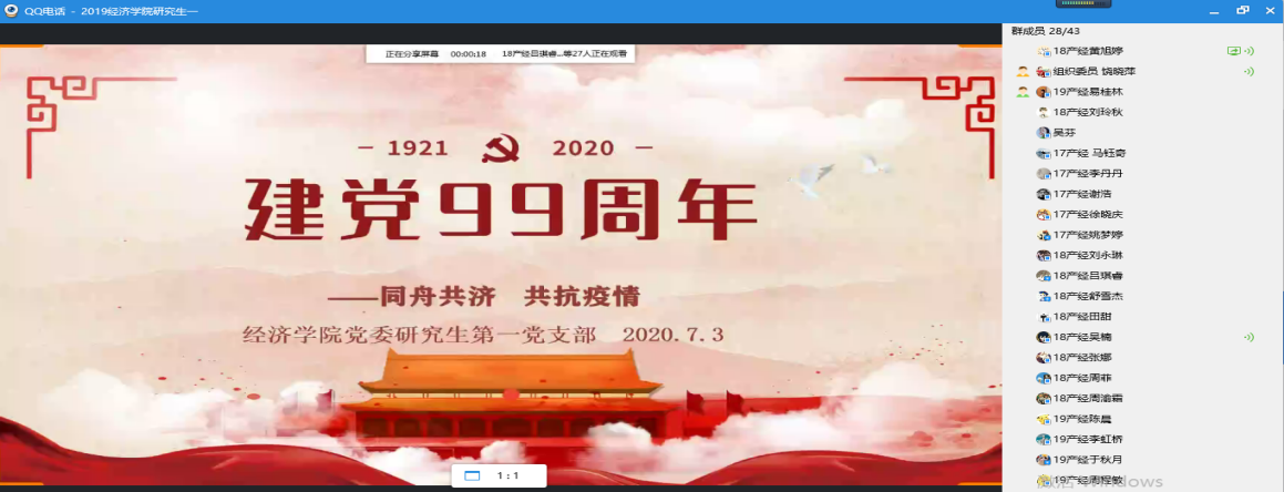 7月3日下午15点,太阳集团tyc122cc党委研究生第一党支部在线上成功举办以“同舟共济、共抗疫情”主题的抗“疫”故事分享会。本次大会由组织委员饶晓萍主持,研究生第一支部全体党员参加此次活动。此次活动旨在持续加强支部建设,切实发挥党组织优势,教育引导师生党员进一步担当起来,坚定信心、经受考验,发挥党员先锋模范作用。大会进行,由黄旭婷同志分享太阳集团tyc122cc分党委研究生第一支部的党员同志的抗“疫”故事。