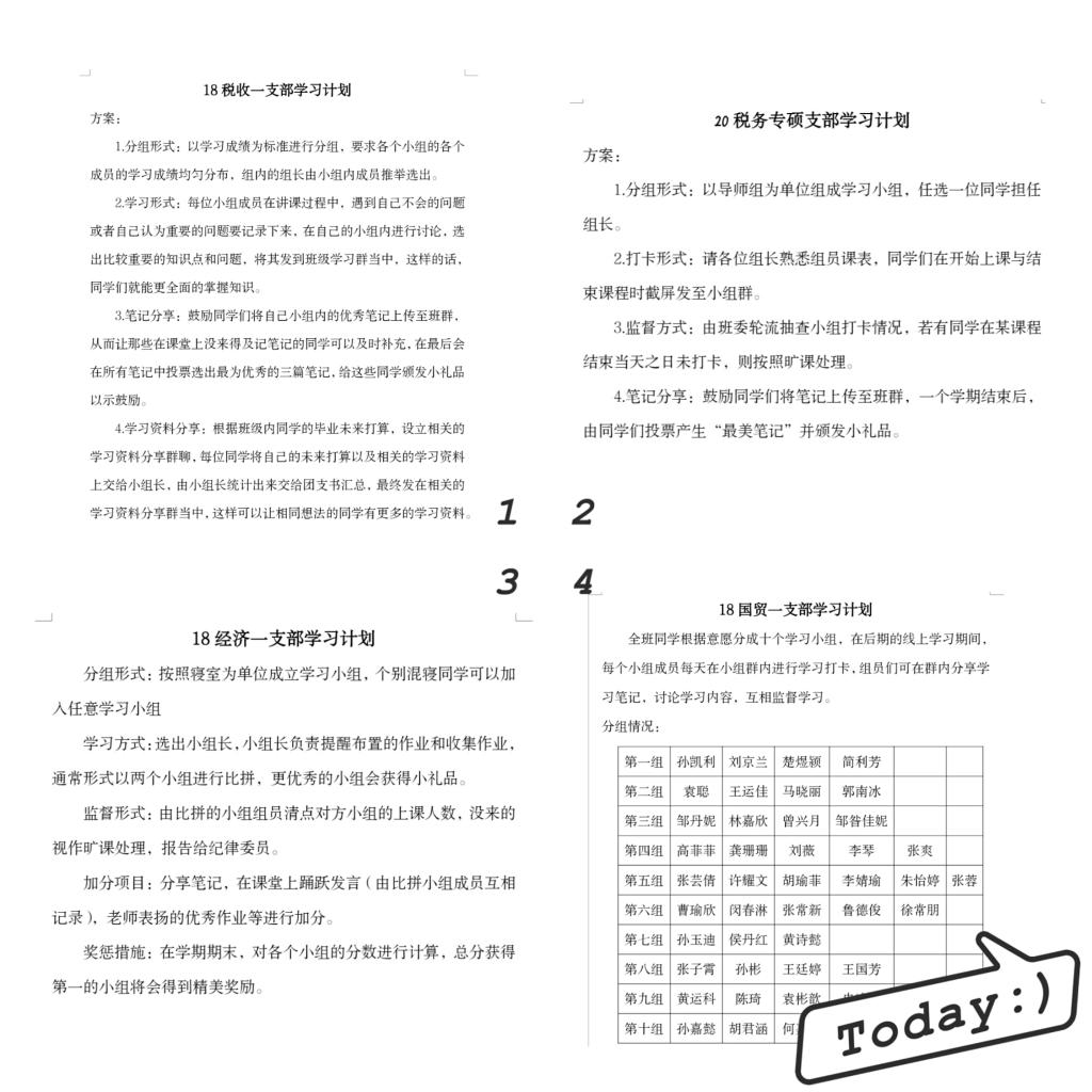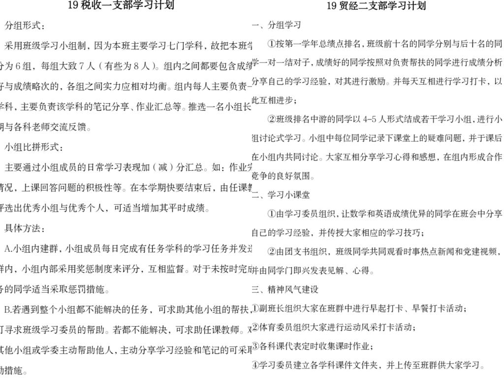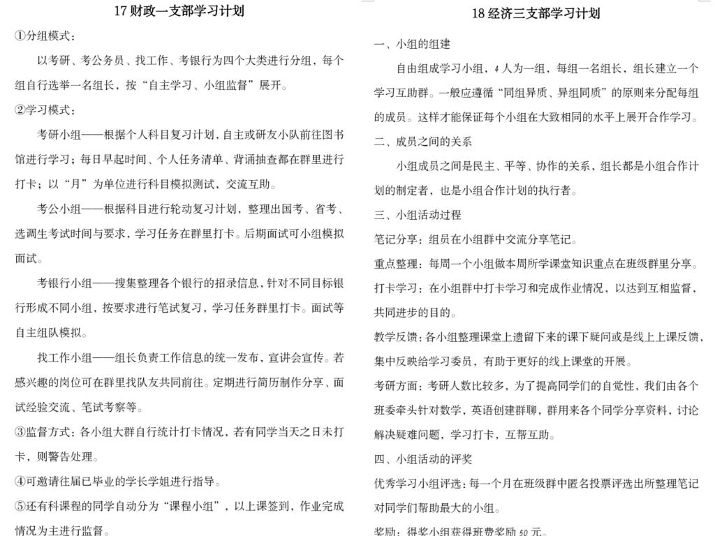 学院各团支部积极响应本次“团支部学习计划”活动,在各团支部成员集思广益下,认真设计出许多利于基层团支部开展、促进各支部成员全面发展的学习方案。各团支部所提交的方案形式多样,内容丰富多彩。其中,2017级毕业年级的支部学习计划大多以“考研考公”“就业”以及“毕业压力”等多方面主题切入,切实关注广大17级支部成员的多方面进步与发展;而研究生支部大多以研究生支部学风建设为重点,从支部成员的学业规划与思想建设等方面入手制定相关学习计划。部分团支部别出心裁,以“小组制”为主要形式,通过支部内小组间的趣味竞争方式激励支部成员认真完成学业任务,同时有助于支部成员间的互帮互助。