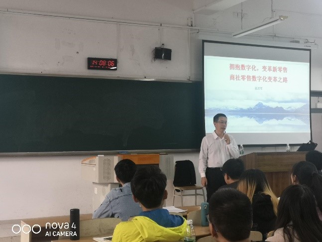 2020年11月10日下午2点,2019级贸易经济专业“零售学”课程“行业精英进课堂”教学活动在博智楼208教室举行,153人的阶梯教室几乎座无虚席。本次活动由教务处副处长宋瑛副教授主持,邀请我校国家级经济学实践教学基地重庆商社(集团)人力资源部张泽军部长作该课程教学内容之一的《拥抱数字化变革新零售——商社数字化之路》的教学授课。