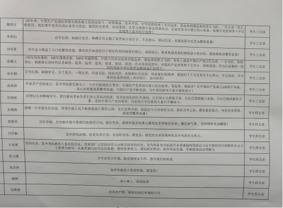 “经历百年苦难,不动不摇;历经风雨,依旧辉煌。党的一百诞辰,愿党永远辉煌,祝祖国国富民强。” “百年前,您历经沧桑,驶出胜利的航向;百年后,您乘风破浪,抒写华丽的篇章;未来百年,中华人民同舟共济,共筑美丽中国梦。”......那一句句简短朴实的表白抒发着对中国共产党炽热的爱。字里行间不仅表达了当代党员对于中国共产党的忠诚,也道出了我们今后的努力方向——齐心协力,共同书写中国的美好未来。