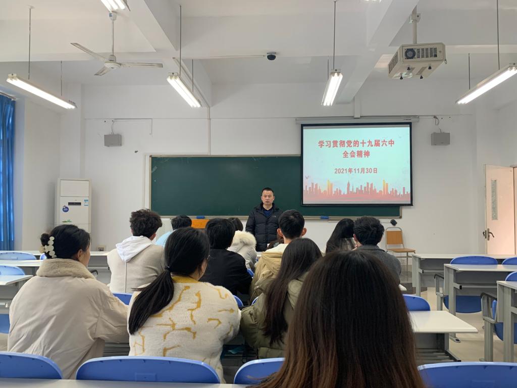 在会上,参会全体党员在喻智成的带领下,先通过一段视频了解了中国共产党历届六中全会。然后通过PPT从“一二三四五十”六个方面重点学习了十九届六中公报。他指出,学习十九届六中全会,必须牢记“一二三四五十”:一个根本问题,一个号召,两个确立,两个始终,三次飞跃,三个需要,四个必须,四次伟大飞跃,五个历史意义,十大经验。他重点解读了十大经验里面的必须坚持人民至上的这个经验,他说,回顾党的百年征程,党无时无刻不把人民放在第一位。从三大纪律八项注意到为人民服务,从密切党同群众的血肉联系到发展为了人民,发展依靠人民,无不体现党的性质和宗旨。作为一名学生党员,必须要有人民至上的理念,服务同学就是服务人民,无论是现在的服务同学还是今后的服务人民,都要坚定理想信念,牢记初心和使命,担当责任,充分发挥党员的先锋模范作用,彰显党员的优秀品格。