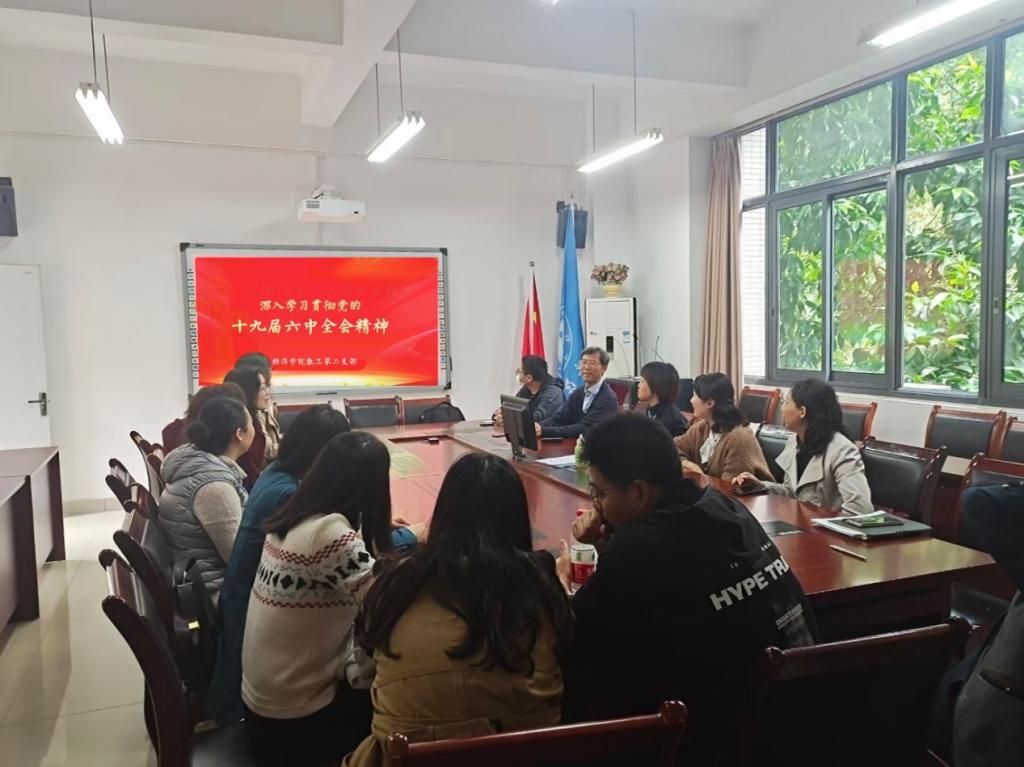 2021年11月19日下午2:00,田家炳书院404会议室,太阳集团tyc122cc教工二支部全体成员集聚在一起,在杨海丽支部书记的主持下,领学十九届六中全会精神,全体成员重温初心和使命,相互交流学习心得和体会。