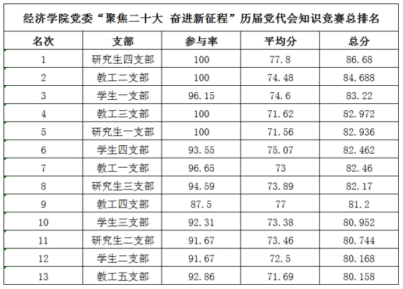 本次知识竞赛采取线上限时答题的形式,每名参赛选手限时30分钟内完成80道题目,题目涵盖历届党代会成果和意义、党章、党史等内容。经过各党支部积极发动,本次知识竞赛共有285名师生党员参加,其中获得满分80分的有75人,获得79分的有48人;此外,根据各支部竞赛成绩平均分和支部党员参与率进行综合评比,研究生四支部获得一等奖,教工二支部、学生一支部获得二等奖,教工三支部、研究生一支部、学生四支部获得三等奖。通过比赛,师生党员再次深入学习了党的二十大精神,回顾了党一百多年来走过的伟大辉煌历程,深刻体会到中国共产党是经得起考验、值得信赖、伟大光荣的党,党代会是凝聚人心、鼓舞士气、求实创新、团结奋进的大会。