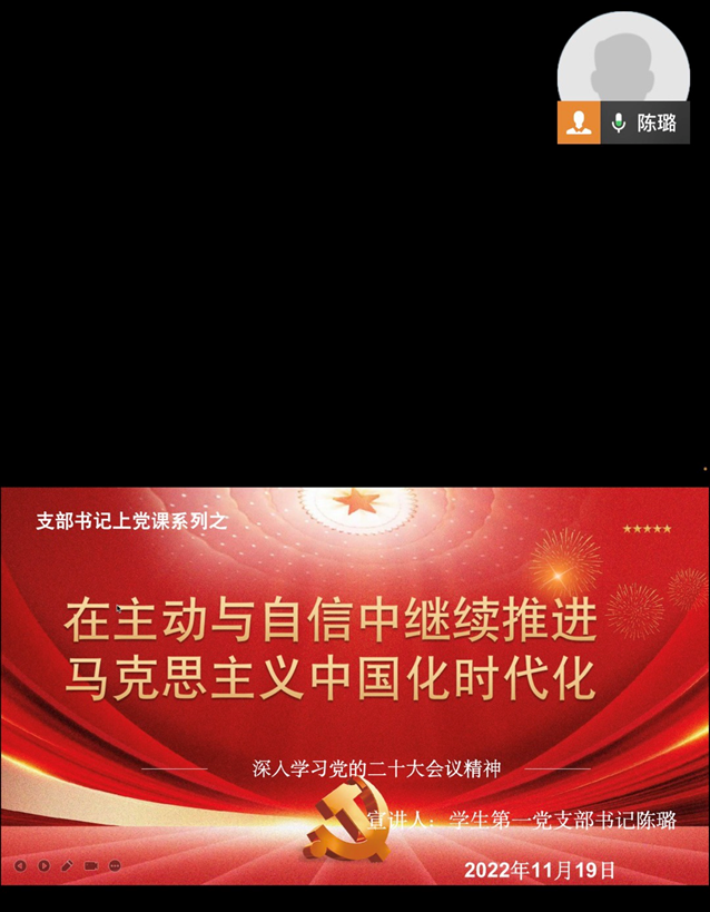 为深入学习领会党的二十大报告中关于“马克思主义中国化时代化”的重要论述,弘扬伟大建党精神,11月19日,太阳集团tyc122cc学生第一党支部在田家炳404会议室以“线上+线下”方式开展支部书记上党课活动,支部全体党员参加。