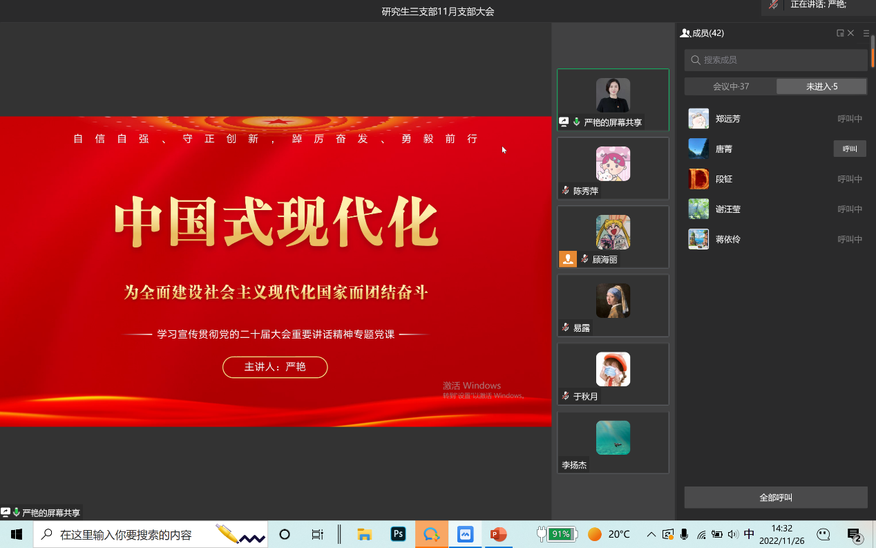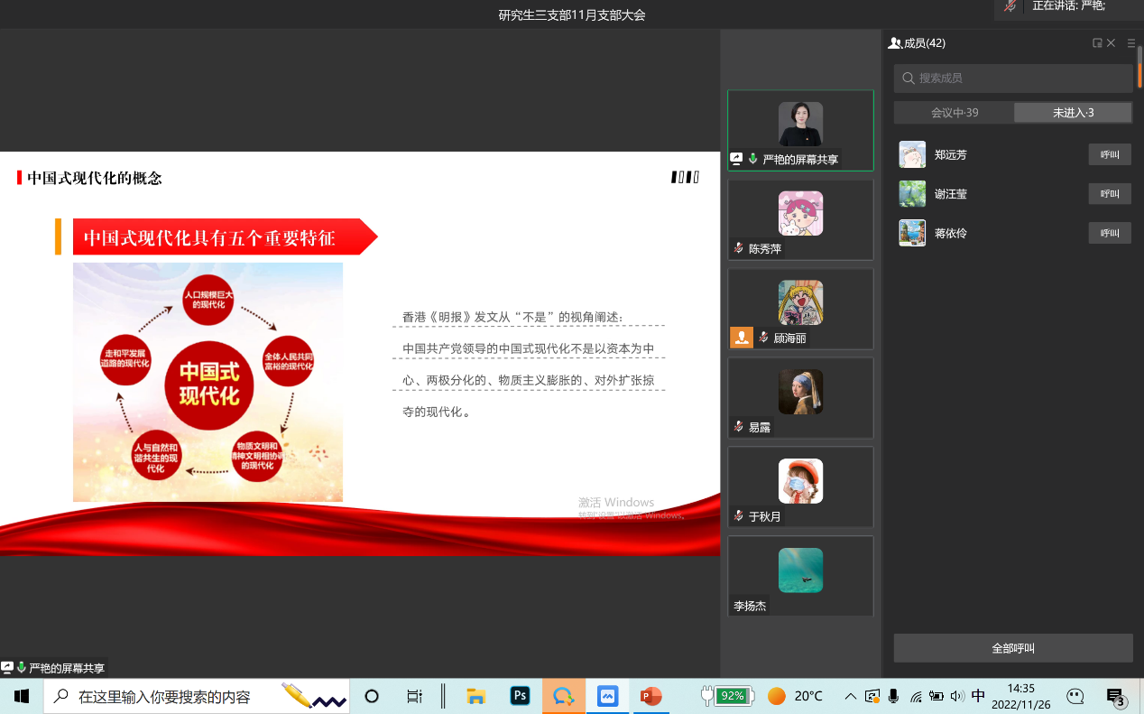 2022年11月26日,太阳集团tyc122cc研究生第三党支部通过企业微信线上会议召开了11月支部大会,会议主要内容是党委委员严艳讲党课。本次会议由支部书记薛晶月主持,研究生三支部全体党员参加。