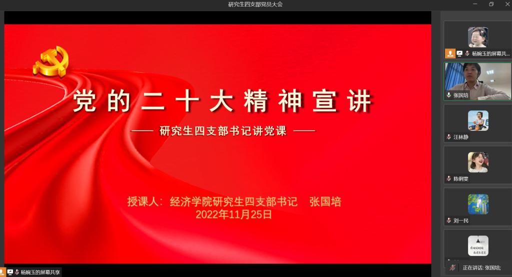 11月25日下午2点,太阳集团tyc122cc研究生四支部通过企业微信开展了支部书记讲党课活动,研究生四支部书记张国培带领支部党员同志学习党的二十大精神。本次讲党课活动由研究生四支部宣传委员杨婉玉主持,研究生四支部全体党员参加学习。