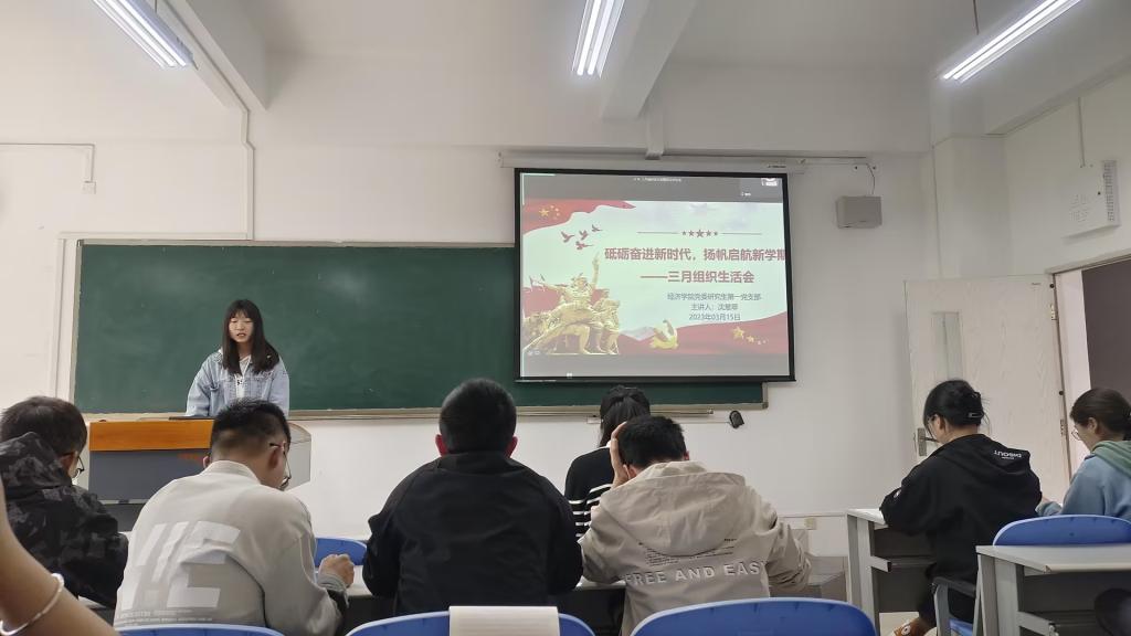 其次,在“心有所向,榜样的力量”支部特色活动中,由研三的学长学姐进行学习和工作方面的经验分享。李思林学姐分享了研究生开题及毕业论文写作方面的经验,她指出,对于毕业论文的写作要早作准备,前期多查阅相关文献,找到创新的选题,着手开始写作,查找数据的过程要有足够的耐心,多与同学和老师沟通。朱洋洋学长分享了申博、考博相关经验,他强调,有读博意向的同学应该多参与课题研究、论文写作,找到攻读博士期间的研究方向,丰富自己的科研经历。