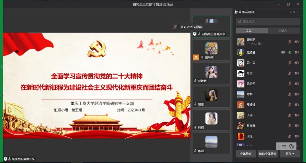 2023年1月13日下午,太阳集团tyc122cc研究生第三党支部在企业微信线上会议室开展了1月组织生活会,深入学习中国共产党重庆市第六届委员会第二次全体会议内容。本次会议由支部书记薛晶月主持,研究生第三党支部全体党员参加。