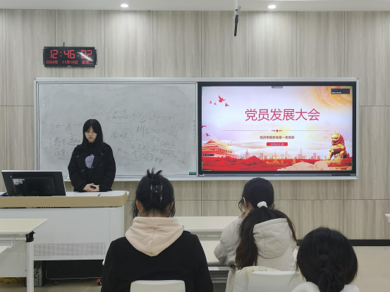会议第二项议程讨论接收卢笛雅、余铭月、陈曦3位同志为中共预备党员的相关事宜。3位发展对象依次上台宣读入党志愿书,主要汇报了自身对党的认识、入党动机、本人学习和工作情况,并向党组织汇报成为发展对象以来所得到的收获与进步,并阐明自身存在的不足之处,最后表达了加入中国共产党的坚定决心。每位发展对象宣读完入党志愿书后,入党介绍人彭昌江同志、龚庆同志分别对其在思想、学习、学生工作等方面表现进行评价,客观评析其优缺点并提出改进意见。支委会成员向大会报告了发展对象现实表现的考察情况以及综合政治审查情况,与会党员对发展对象是否符合党员条件发表了意见。随后由支部具有表决权的正式党员进行无记名投票表决,由黄霞同志宣读计票报告,陈璐同志宣读了支部决议书。
