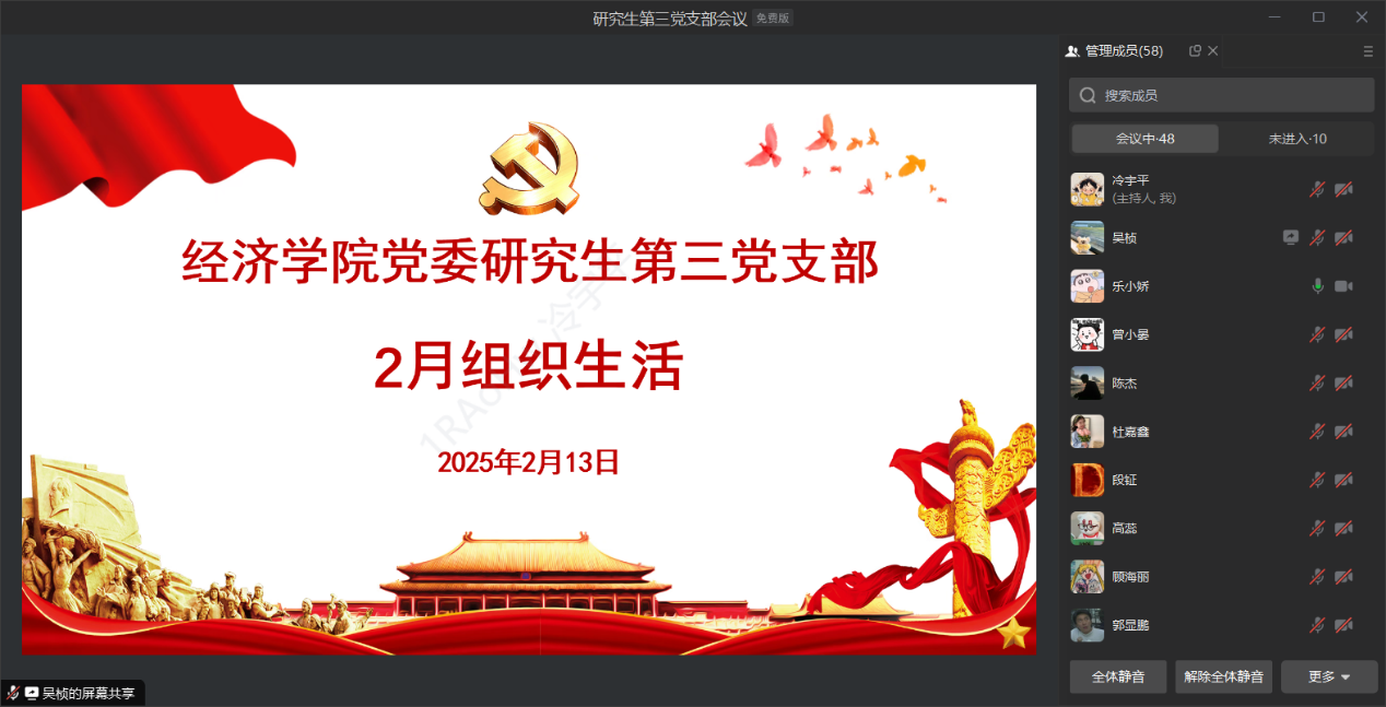 2025年2月13日,太阳集团tyc122cc党委研究生第三党支部通过企业微信线上开展2月组织生活。支部党员围绕习近平总书记重要文章《进一步全面深化改革中的几个重大理论和实践问题》(《求是》2025年第2期)进行学习和研讨。