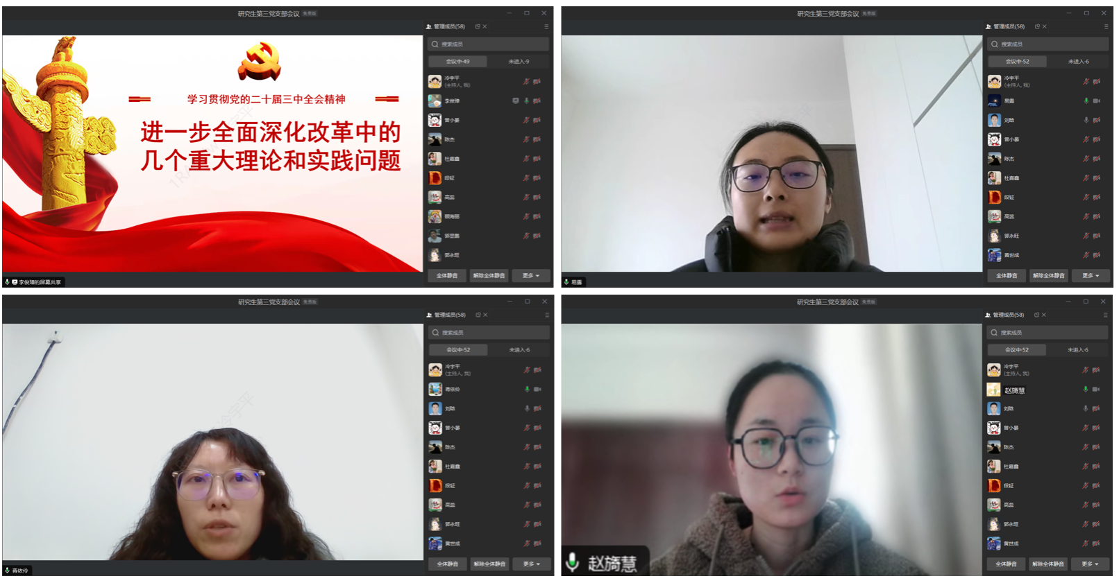 随后,支部党员围绕此次学习内容展开了热烈的交流讨论。支部党员蒋依伶说,进一步全面深化改革必须坚持守正创新。守正是根本,创新是动力,只有两者结合,才能确保改革始终沿着正确方向前进。支部党员易露认为,把握高质量发展,作为研究生应关注全面绿色转型现实问题,为深化改革献言献策。支部党员赵旖慧提出,只有持续深化改革,才能及时化解发展中的矛盾,让国家在高质量发展的道路上稳步迈进。