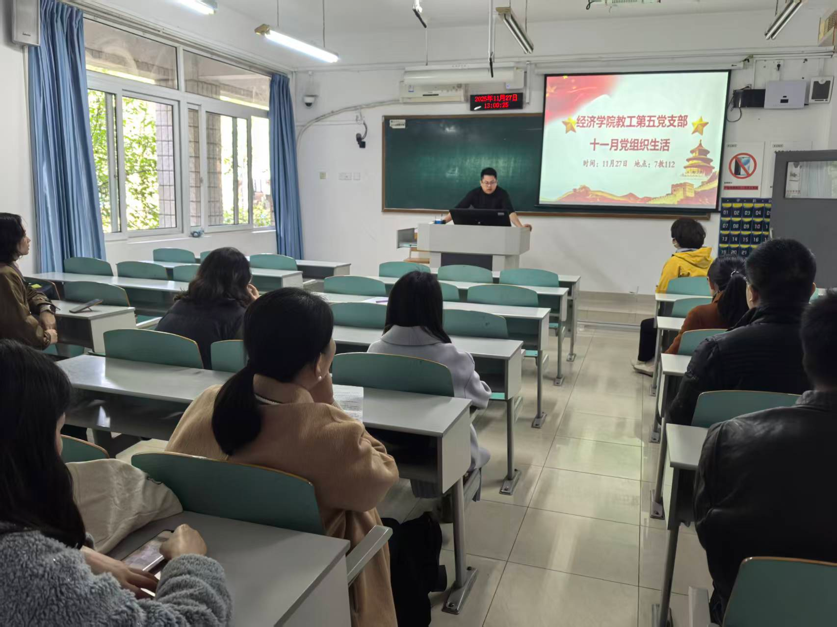 2025年11月27日下午,太阳集团tyc122cc教工第五党支部在七教112教室开展了11月党组织生活。会议以集中学习“党的二十届四中全会”精神为核心主题,全程由支部书记林黎主持,全体党员参会。