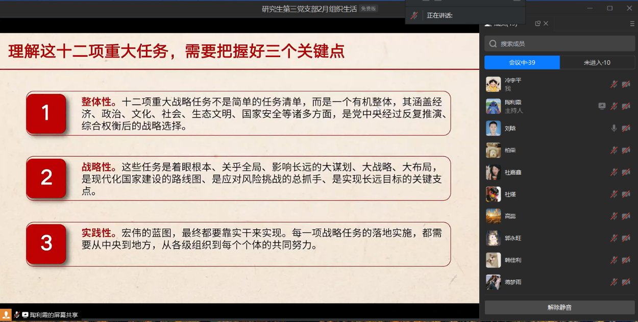 课程由中央党校权威专家主讲,包括:“‘十五五’时期经济社会发展的指导思想、重大原则和根本保证”和“‘十五五’时期经济社会发展的重大战略任务”两个专题内容。课程强调以全面建成社会主义现代化强国为目标,以中国式现代化全面推进中华民族伟大复兴,统筹推进“五位一体”总体布局和“四个全面”战略布局,坚持稳中求进工作总基调,推动高质量发展与共同富裕协同共进。支部党员对制定“十五五”规划的重大意义和《建议》的基本结构、“十五五”时期是基本实现社会主义现代化的关键时期、“十五五”时期经济社会发展的指导方针和主要目标等内容进行集体学习,分别对产业发展、科技创新、国内市场、经济体制、对外开放、乡村振兴、区域发展、文化建设、民生保障、绿色发展、安全发展、国防建设这十二个重要领域的重点任务进行学习,对于“十五五”时期围绕中国式现代化系统工程在经济社会发展方面所开展的重点工作有了较为清晰的认识。