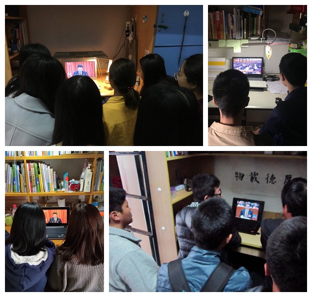 通过直播是师生们了解到:党的十九大,是在全面建成小康社会决胜阶段、是中国特色社会主义发展关键时期召开的一次十分重要的大会。承担着谋划决胜全面建成小康社会、深入推进社会主义现代化建设的重大任务,事关党和国家事业继往开来,事关中国特色社会主义前途命运,事关最广大人民根本利益。会议上,习近平总书记作报告时指出:“不忘初心,方得始终。中国共产党人的初心和使命,就是为中国人民谋幸福,为中华民族谋复兴。这个初心和使命是激励中国共产党人不断前进的根本动力。”、“行百里者半九十。中华民族伟大复兴,绝不是轻轻松松、敲锣打鼓就能实现的。全党必须准备付出更为艰巨、更为艰苦的努力”等重要讲话。这些无时无刻不以人民对美好生活的向往为奋斗目标的庄严承诺都是中国共产党对人民的深情表白。