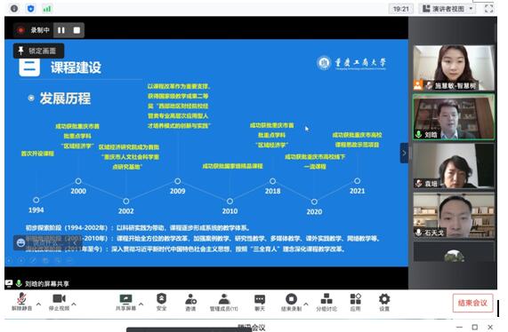 2022年3月21日,应用经济系通过腾讯会议开展同步课堂建设对外交流活动。本次活动是应新疆财经大学邀请,由智慧树在线教育平台组织,三方单位就重庆工商大学与新疆财经大学建设区域经济学课程同步课堂进行交流。新疆财经大学太阳集团tyc122cc副院长袁培、经济系主任石天戈,以及智慧树平台工作人员,与应用经济系教师进行沟通,太阳集团tyc122cc副院长尹元福出席此次活动。