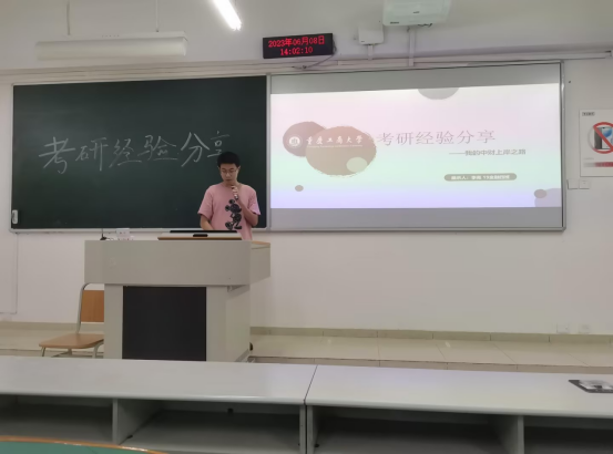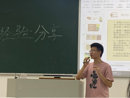 下午14点,经验分享会正式开始,现场全体与会人员均落座。班导师郭鹏飞首先上台发言,清晰地阐明了本次会议的主题,之后介绍了李亮学长的基本情况及其上岸学校。随后,李亮学长正式开始进行考研经验分享,他首先详细地向大家介绍了自己的专业、报考院校和研究方向、最后的成绩以及官方的录取结果;其次,主要从四个部分进行展开,即如何确定自己的志愿、备考经验、复试心得、如何更好的准备,内容十分细致全面。特别地,李亮学长每部分都会根据自己的一些真切地经历感受来讲述,例如在备考经验讲解过程中,他将自己每门课所用的实用高效的方法都分享给大家,并且在PPT附有自己备考过程中的图片,真实且颇有益处;分享复试心得时,把自己当时的心路历程结合整个大概过程制作成短视频播放,十分真切,极具感染力。最后一个环节是答疑解惑环节,有两位同学当场向李亮学长提出了自己内心的问题,李亮学长都结合着自己的经验作出解答,给出建议。整场经验分享会结束后,同学们纷纷表示本次的经验分享会对自己在未来考研过程中择校、学习方法以及心态方面都有很大帮助。