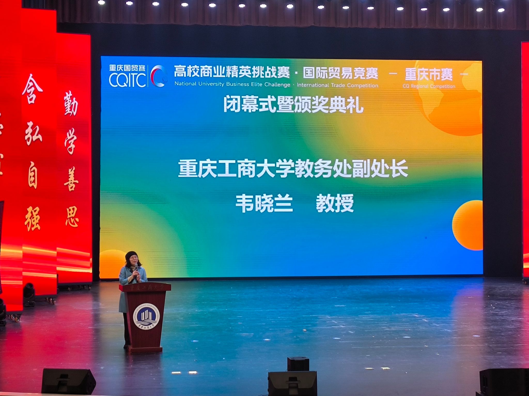 闭幕式暨颁奖典礼上,我校教务处副处长韦晓兰教授致辞。她首先对各位领导、评委和各院校师生的到来表示热烈欢迎。韦晓兰指出,每年一届的高校商业精英挑战赛国际贸易竞赛重庆市赛是我校承办的大型经贸类学科竞赛,是重庆市各高校同学及老师交流的重要平台。我校也将借此次竞赛为契机进一步为重庆市学科竞赛教育服务贡献力量。