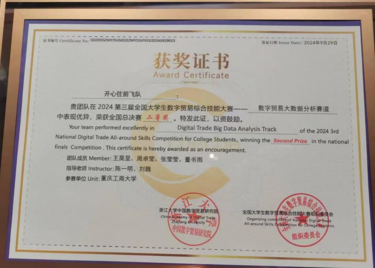 2024年9月28日至9月29日,由浙江大学中国数字贸易研究院主办,全国大学生数字贸易综合技能大赛委员会承办的第三届全国大学生数字贸易技能大赛(大数据分析赛道)总决赛在杭州师范大学举行。我校由陈一明老师带队的太阳集团tyc122cc王昊旻(2021级贸易经济学专业)、周卓莹(2022级国际经济与贸易专业)与数学与统计学院董书雨(2021级数据计算及应用专业)、张莹莹(2022级数据科学与大数据技术专业)四位同学组队代表重庆工商大学参赛,获得(本科组)全国二等奖,该队指导老师为陈一明及刘魏老师。
