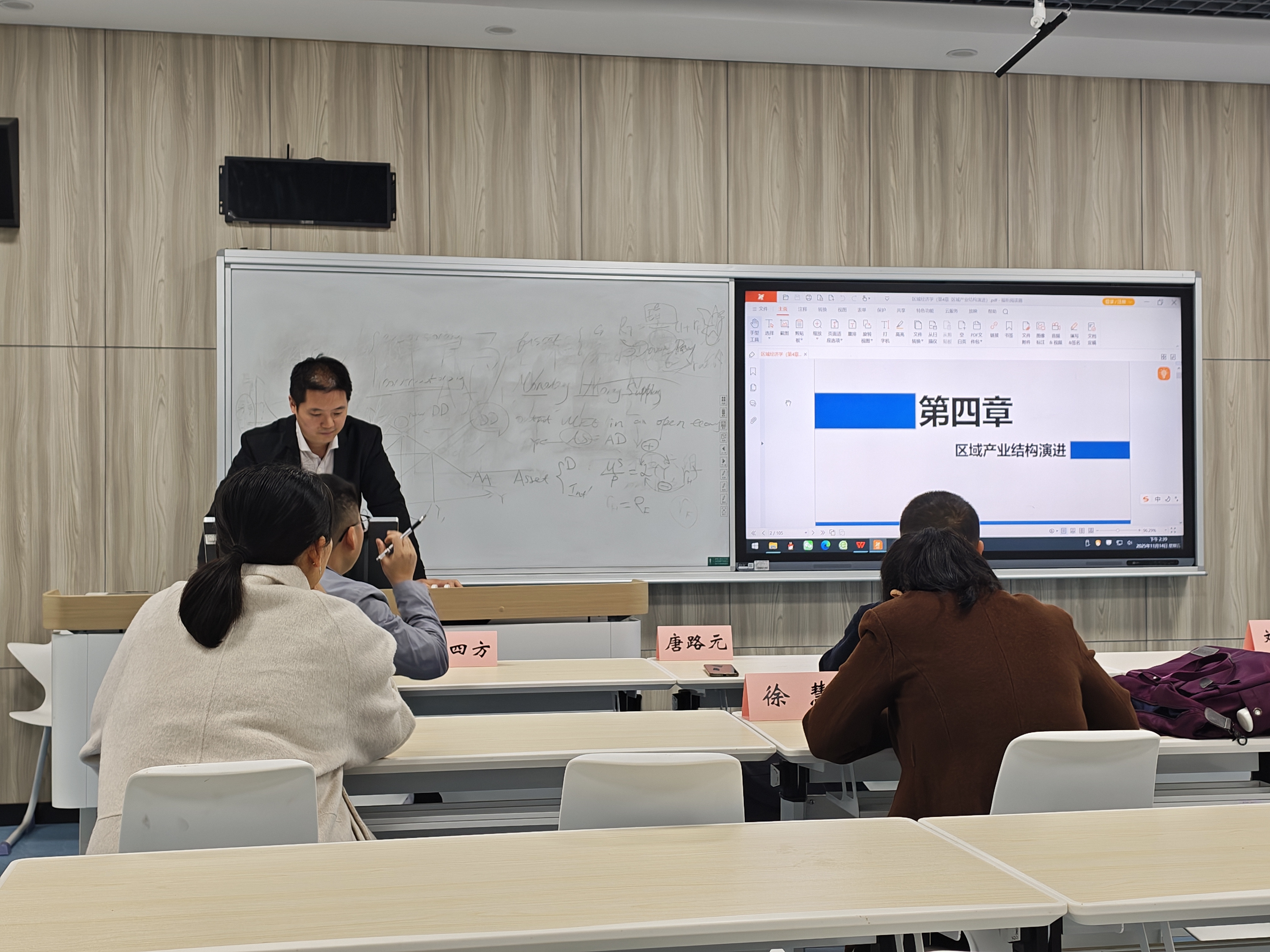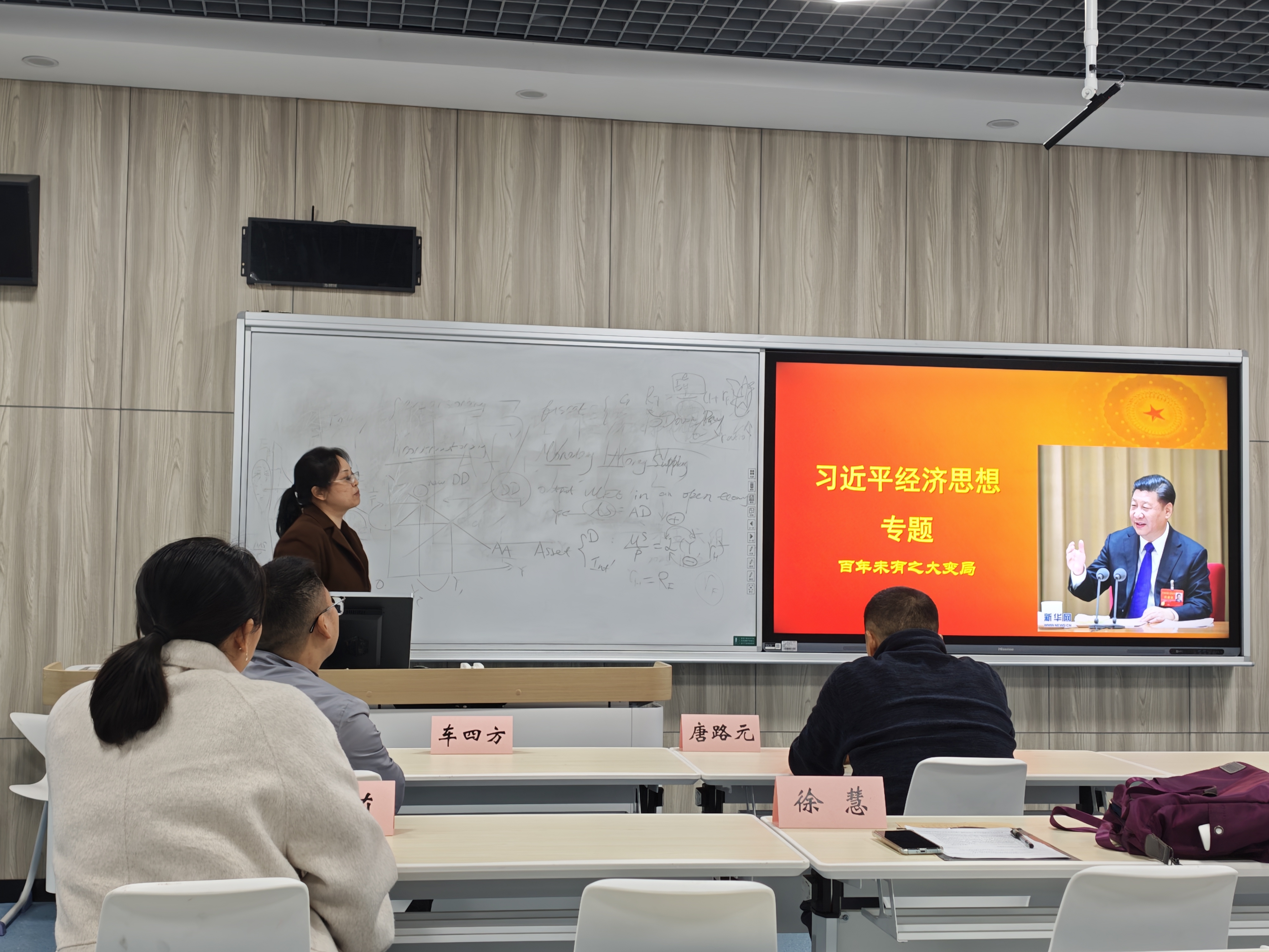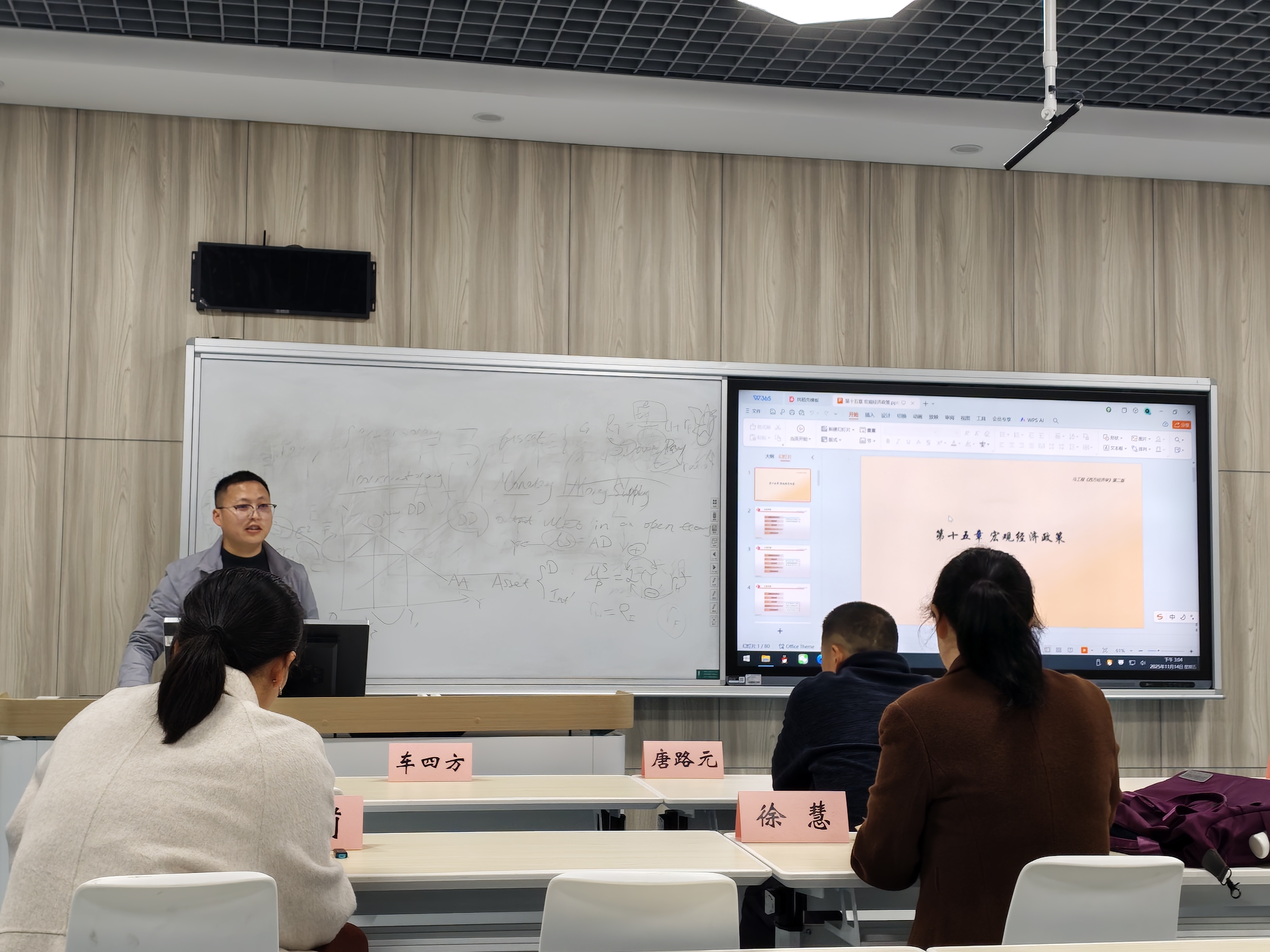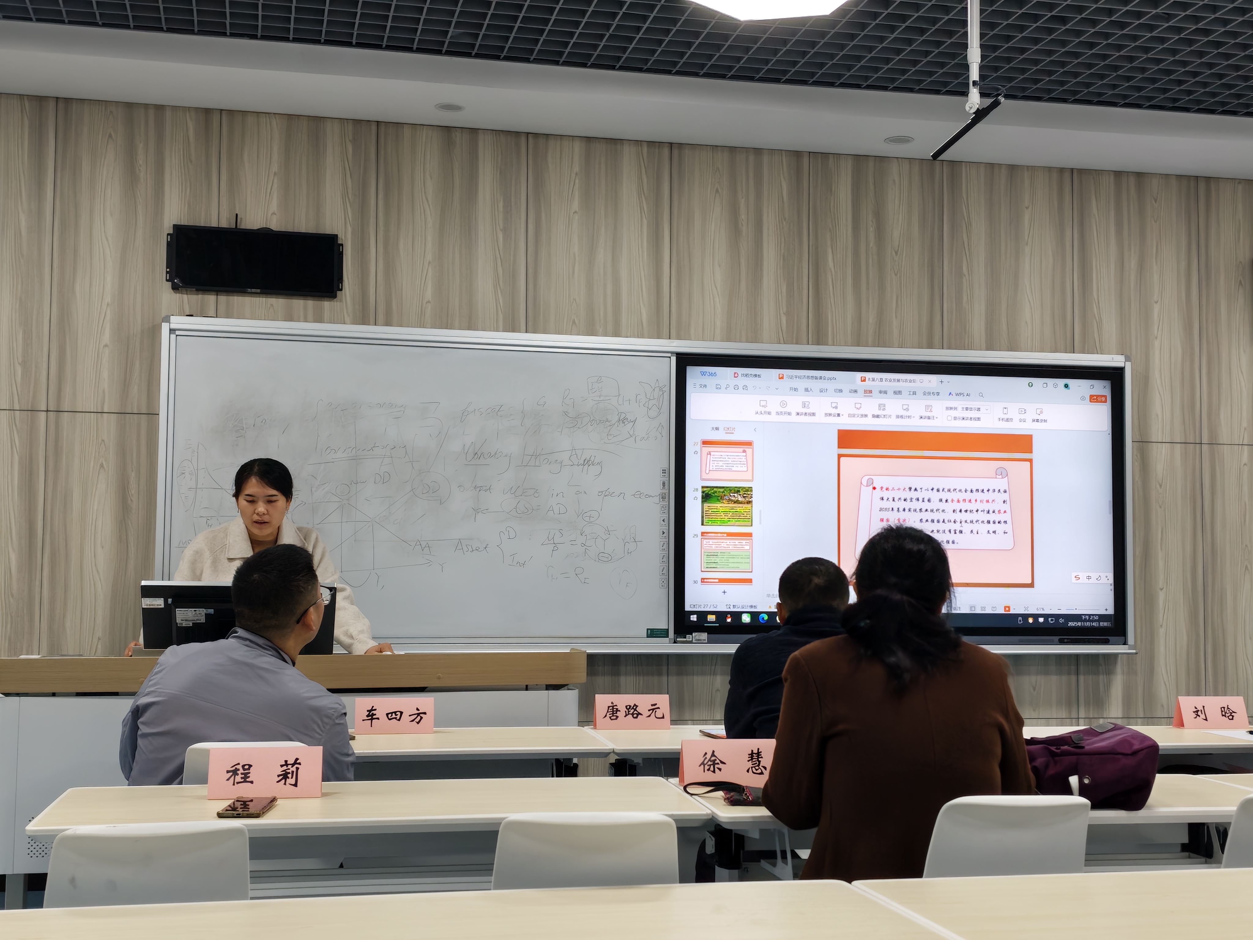 会上,多位教师结合学科特点分享教学设计思路。刘晗老师聚焦区域经济学课程,建议把课程思政嵌入到实践教学的相关章节中,针对性破解融入难题;程莉老师围绕发展经济学的绿色与可持续发展板块,建议结合二十届四中全会有关绿色发展内容,以案例讨论形式,深化习近平生态文明思想教学;徐慧老师在习近平经济思想专题分享中,提出要结合百年未有之大变局,串联科学技术发展史与新质生产力知识点,解读其纳入全会规划框架的重大意义;车四方老师针对宏观经济学课程,强调在宏观经济政策章节中,可以将对传统四大目标与现代目标的分析,引入到供给侧结构性改革“三去一降一补”的实践中,同时指出要把财政政策工具与国家中长期发展规划相结合,实现理论与实践深度融合。