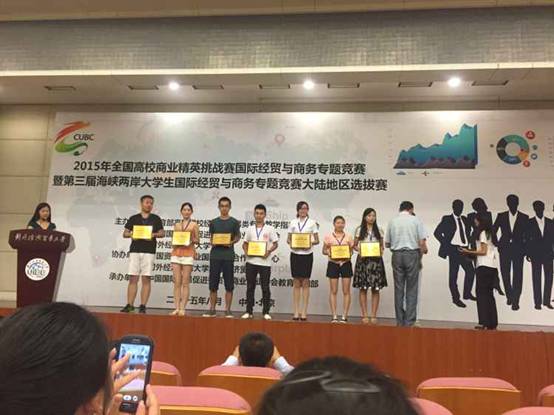 8月22-24日,2015年全国高校商业精英挑战赛国际经贸与商务专题竞赛暨第三届海峡两岸大学生国际经贸与商务专题竞赛大陆地区选拔赛在北京对外经贸大学拉开帷幕。本次大赛由教育部高等学校经济与贸易类专业教学指导委员会、中国国际贸易促进委员会商业行业分会、对外经济贸易大学主办,旨在促进海峡两岸高等院校经贸教育的专业交流与合作,提升海峡两岸大学生国际经贸与商务专业知识综合运用水平和应用学术研究能。参加本次大赛的院校来自对外经贸大学、上海财经大学、西南财经大学等26所高校,共46只队伍。