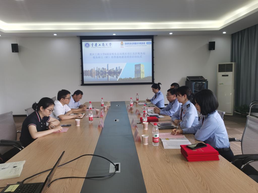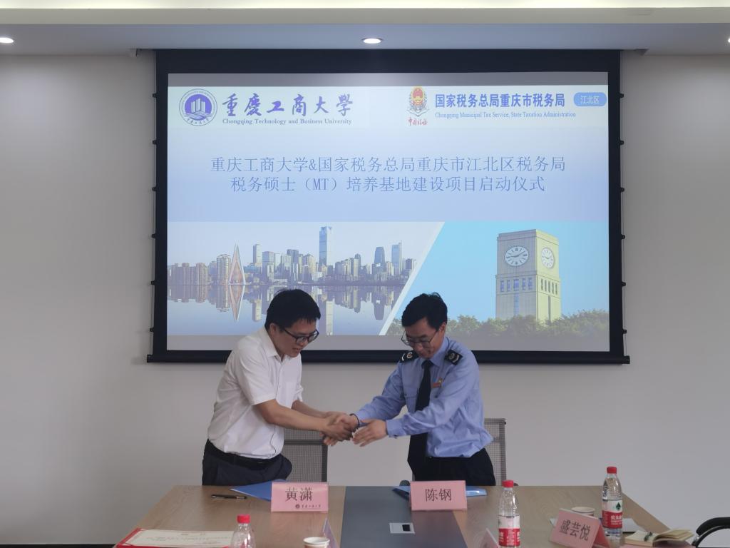 6月23日,我院与国家税务总局重庆市江北区税务局在重庆工商大学田家炳406会议厅举行税务硕士联合培养基地建设项目签约启动仪式,双方签署了合作协议,为“税务硕士联合培养基地”揭牌。我院黄潇副院长、税务硕士教育中心主任尚可文教授、杨娟博士,江北区税务局陈钢副局长,第一税务所和纳税服务科相关负责人出席启动仪式,事业导师代表,相关税务骨干及税务硕士代表参加仪式。