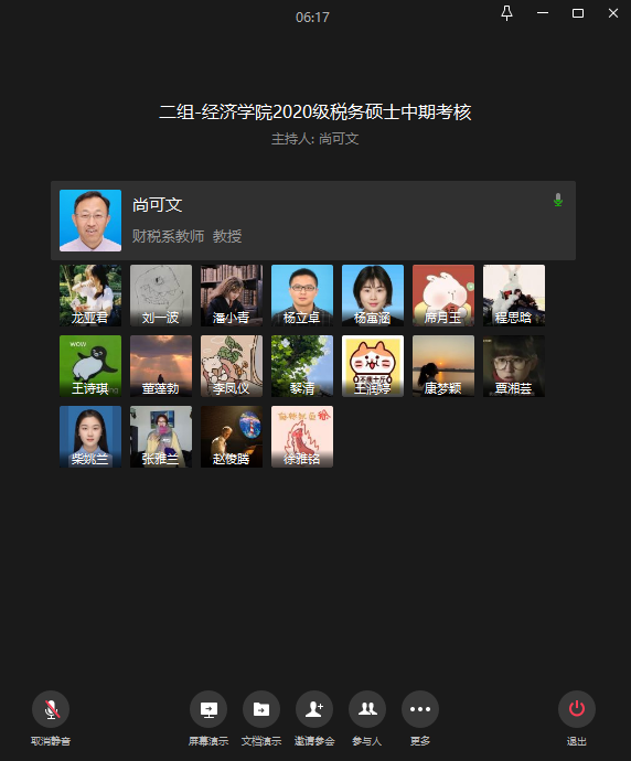 2022年1月7日,太阳集团tyc122cc通过企业微信线上会议形式组织召开2020级税务硕士中期考核及论文中期检查。尚可文、汤凤林等6位导师参与了本次考核及检查。