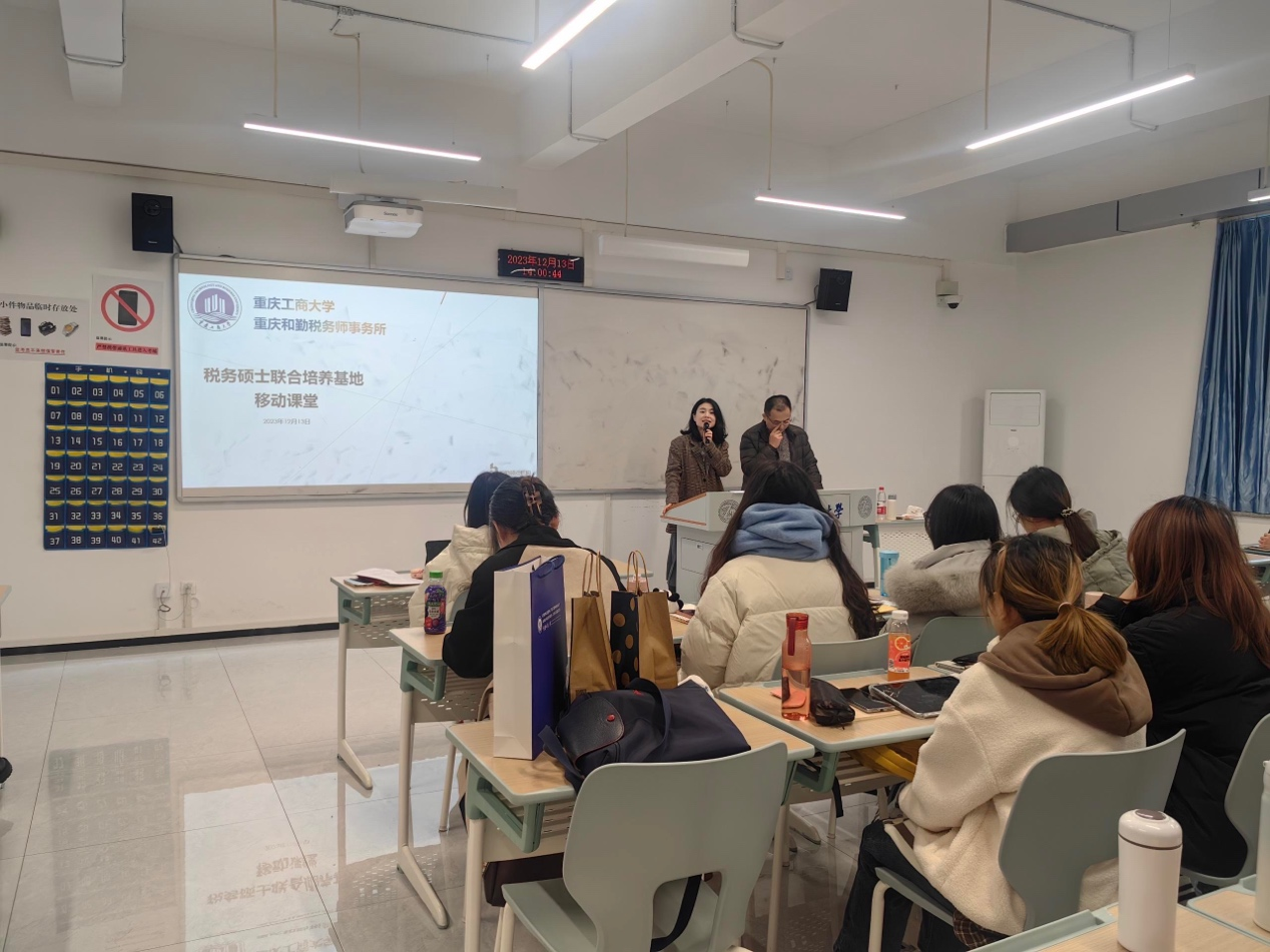 2023年12月13日,“重庆工商大学-重庆和勤税务师事务所”市级研究生实践基地移动课堂在我校研究生院举行。重庆和勤税务师事务所副所长兼我校研究生实践基地事业导师葛勤毅;“重庆工商大学-重庆和勤税务师事务所”市级研究生实践基地负责人杨寓涵博士,财税系老师杨娟博士以及36名税务专硕研究生参与此次活动。
