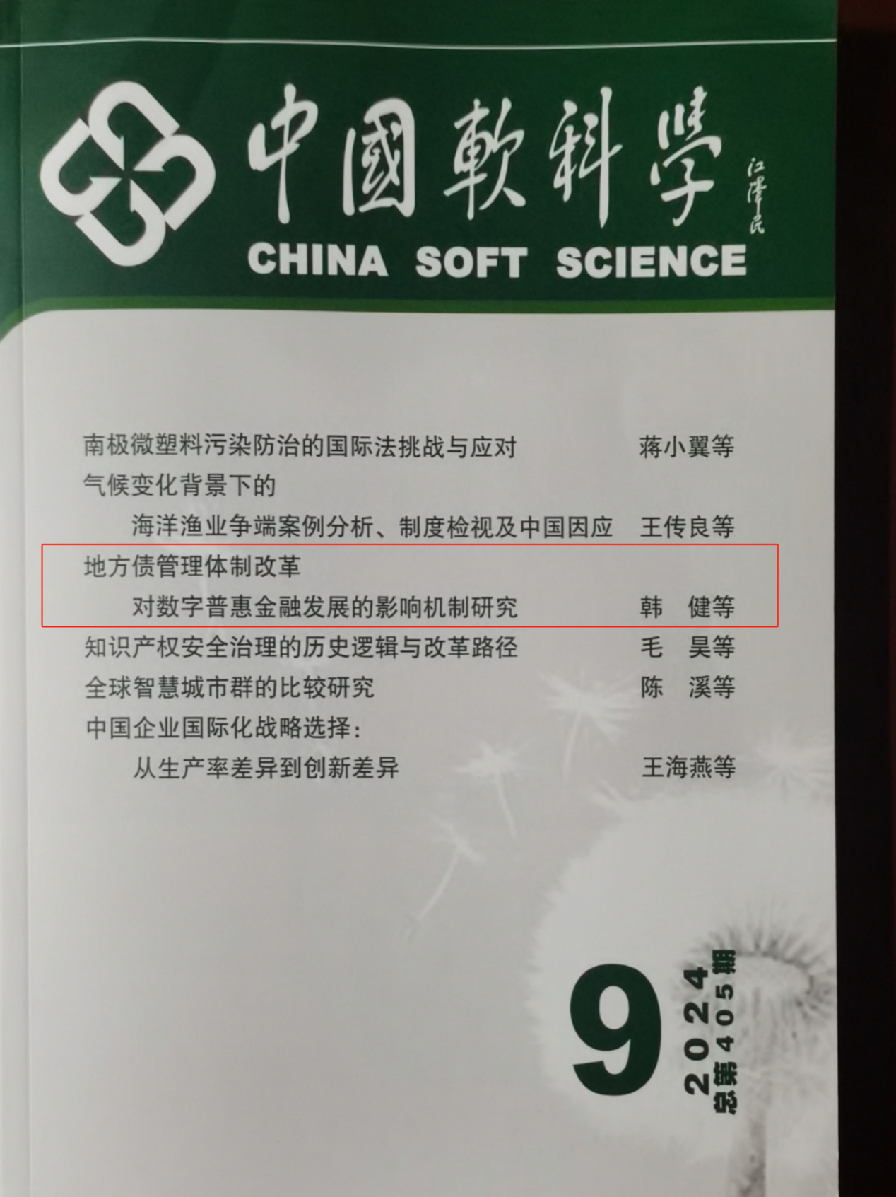 太阳集团tyc122cc韩健教授学术论文《地方债管理体制改革对数字普惠金融发展的影响机制研究》在《中国软科学》期刊2024年第9期发表,并入选期刊封面文章。《中国软科学》(CSSCI)创刊于1986年,是由中华人民共和国科学技术部主管的国家一级学术期刊(2023版复合影响因子:6.707)。