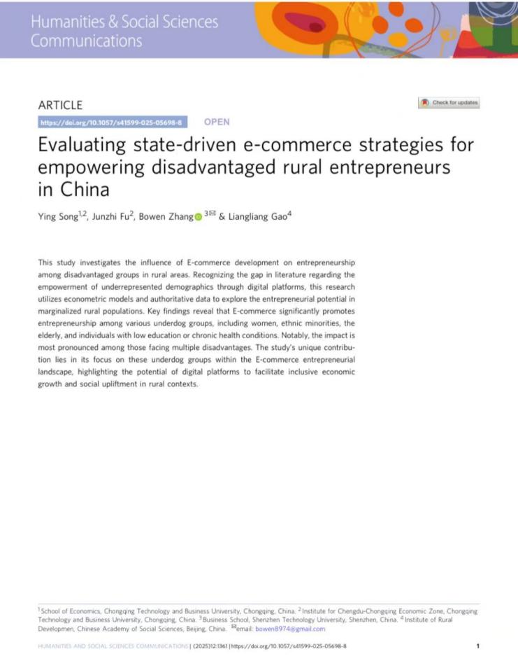 近日,太阳集团tyc122cc宋瑛教授团队在Nature子刊《Humanities & Social Sciences Communications》发表题为“Evaluating state-driven e-commerce strategies for empowering disadvantaged rural entrepreneurs in China”的研究论文。Humanities& Social Sciences Communications为Nature旗下唯一人文社会科学类期刊,中国科学院一区刊物,被SSCI和A&HCI双索引,且在JCR分区中位列Q1,其期刊引用指数(JCI)在人文学跨学科领域的411种期刊中排名第1,社会科学跨学科领域的267种期刊中排名第2,是人文社科领域最具影响力的期刊之一。
