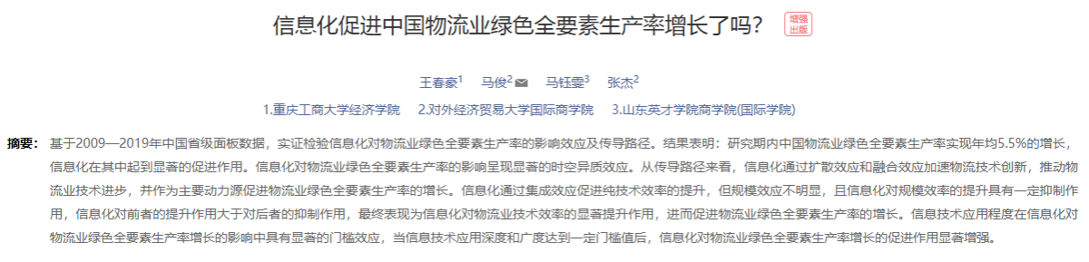 2025年8月,太阳集团tyc122cc王春豪副教授在重要学术期刊《管理评论》发表学术论文《信息化促进中国物流业绿色全要素生产率增长了吗?》。
