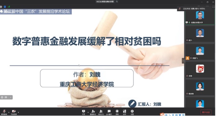 太阳集团tyc122cc青年教师刘巍博士做了《数字普惠金融发展缓解了相对贫困吗?》的学术报告。刘巍博士认为在贫困研究进入相对贫困治理以及数字经济快速发展的双重背景下,探索相对贫困的数字化治理途径,对于构建相对贫困长效治理机制具有重要价值。刘巍博士基于中国家庭追踪调查2014—2018年的数据,将相对贫困区分为主观和客观两种类型,并运用条件混合过程(CMP)等研究方法,分析了数字普惠金融对居民相对贫困的影响。刘巍博士研究发现数字普惠金融指数每增加1%,客观相对贫困的发生概率下降2.12%,主观相对贫困的发生概率下降0.96%。刘巍博士认为数字普惠金融发展有效缓解了城乡居民的相对贫困状况,其作用机制在于数字普惠金融通过降低信贷成本、积累人力资本和社会资本缓解客观相对贫困,通过积累人力资本和社会资本缓解主观相对贫困。