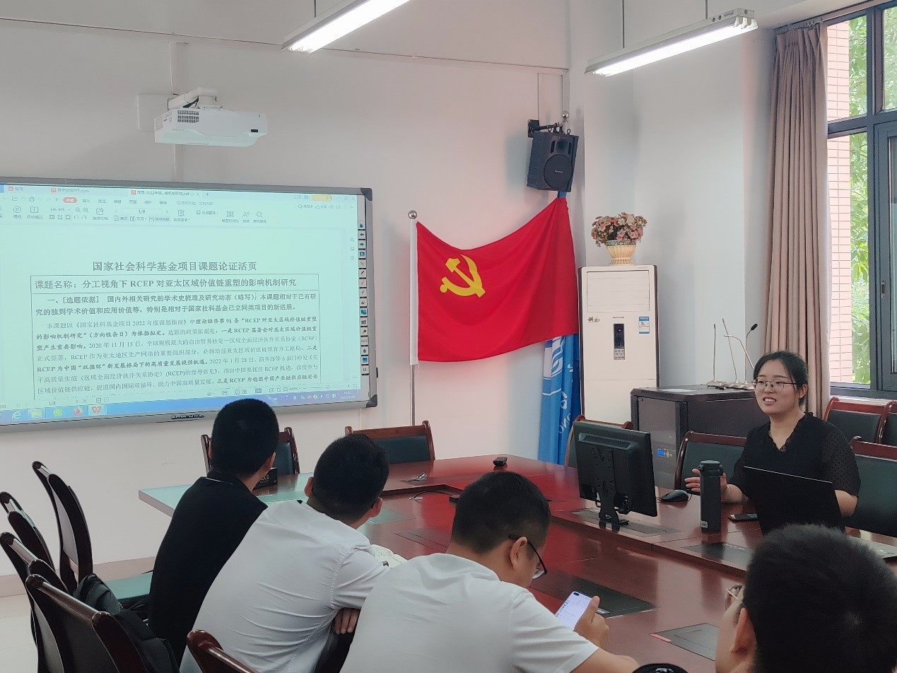 青年教师雷俐博士做了国家社科课题撰写及经验分享的报告。雷俐博士获批2022年国家社科基金青年项目,其立项题目为《分工视角下RCEP对亚太区域价值链重塑的影响机制研究》,该课题以RCEP“三个自由化便利化”为切入点,基于劳动分工理论,以深化区域价值链分工为指引,研究RCEP对亚太区域价值链重塑的相关理论、现实状况、影响机制与中国应对策略等,以期为中国构建以国内大循环为主体、国内国际双循环相互促进的新发展格局提供理论参考和政策依据。除此之外,雷俐博士还从国家社科申报的前期准备、申报书打磨、细节优化等方面和与会博士进行了深入交流。