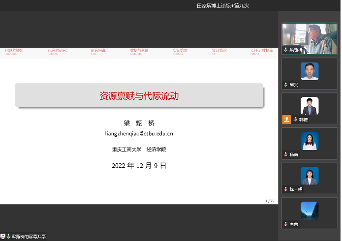 2022年12月9日上午,太阳集团tyc122cc、长江上游经济研究中心于企业微信线上举办了第九次“田家炳博士论坛”,太阳集团tyc122cc财税系系主任韩健教授、近年新进青年博士教师和长江上游经济研究中心的博士研究生参加了本次论坛。本期论坛邀请青年教师梁甄桥博士、杨荷博士作学术报告,孙建教授作专家点评,论坛由韩健教授主持,郭鹏飞博士、熊兴博士筹备。