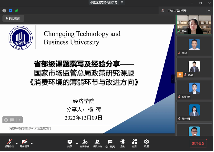 青年教师杨荷博士作了《省部级课题撰写及经验分享》的学术报告。杨荷博士以国家市场监管总局政策研究课题《消费环境的薄弱环节与改进方向》为案例从选题来源、研究内容和相关成果等方面分享了其省部级课题的撰写经验。杨荷博士在《消费环境的薄弱环节与改进方向》课题中认为,破题消费环境的薄弱环节,是营造放心消费环境、保持居民消费潜力持续释放的必要前提;同时,明晰消费环境的改进方向,是营造放心消费环境、推动我国消费高质量发展的应有之义。杨荷博士以居民消费环境的薄弱环节为切入点,以消费经济学的消费行为及其影响因素、消费者权益保护理论、消费环境优化理论为理论依据,研究居民消费趋势变化的一般规律,概括消费环境的科学内涵及基本特点,构建居民消费环境评价指数,剖析消费环境的薄弱环节与影响因素,最后提出改进消费环境的主要方向和政策建议。孙建教授认为杨荷博士课题申报的经验分享十分应景,在课题申报方面我们应开放视野,各级各类项目都需要关注,并结合自身的项目申报经验从课题指南、选题、政策背景等方面进行了分享。同时,孙建教授对课题成果和论文撰写过程中的指标体系评价、研究方法、文本分析、研究数据、调查数据的储备等方面进行了点评。