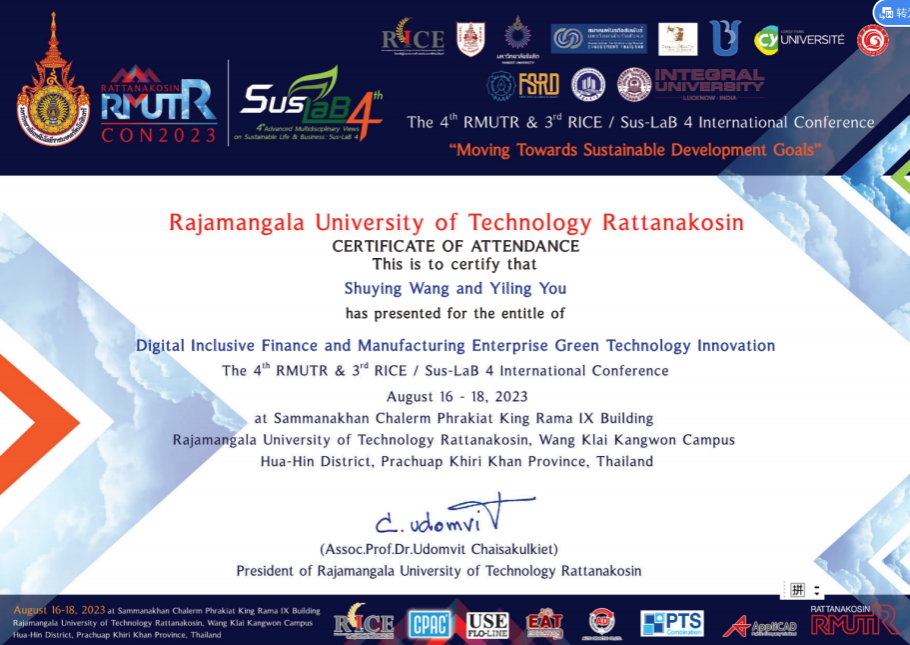2023年8月16日至18日,我校太阳集团tyc122cc2020级国际经济与贸易一班学生游艺玲同学在国际学术会议The 4th RMUTR & 3rd RICE/ Sus-LaB 4 International Conference上进行汇报,并得到了专家评委的高度评价。会议为线上线下同步进行,线下会议在泰国兰塔纳功欣皇家理工大学举行。