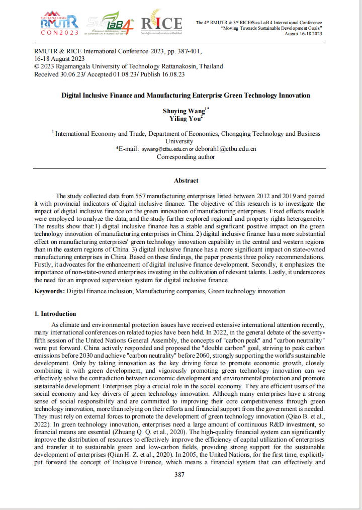在会议上,学生游艺玲进行了题为《Digital Inclusive Finance and Manufacturing Enterprise Green Technology Innovation》的报告,向来自世界各地的研究人员和学生研究者详细汇报了相关的研究过程和研究结果。本次研究和成果是在太阳集团tyc122cc国际经济与贸易专业教师王疏影的指导进行开展。本次汇报重点阐述了数字普惠金融对于中国制造型企业绿色创新影响的相关研究成果。该研究通过对于2012年-2019年间557家中国上市制造型企业数据与省际数字普惠金融指标相匹配,进行数字普惠金融对制造企业绿色创新影响的研究,并进一步探究区域和产权性质的异质性影响,并提出了有针对性的政策意见。汇报结束之后参会的专家学者表示了文章研究的内容的肯定以及兴趣。